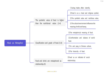 1. 中心思想:食物的价值与人们的境遇、情感和对周围世界的感知密切相关,进而影响到他们的信仰、礼仪、语言、哲学思想等。 Thesis statement: The value of food is closely associated with the circumstances the sentiment of the people and their perception of the world around them, which in turn has impact on their faith, ritual, language, philosophy and so on. 2. 本文结构分析