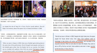 通过牡丹亭具体案例的新闻报道,引导学生探讨《牡丹亭》海外演出成功的原因及其对中国文化海外传播的意义。选出个别代表,谈谈他们对此的观察与思考,包括对中国文化海外传播的感受和启示,建立他们的文化自信。分享结束后,其他学生可提问或发表不同看法,促进全班范围内的交流与互动。