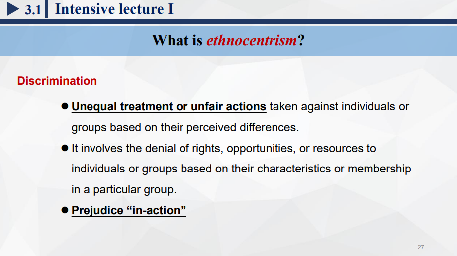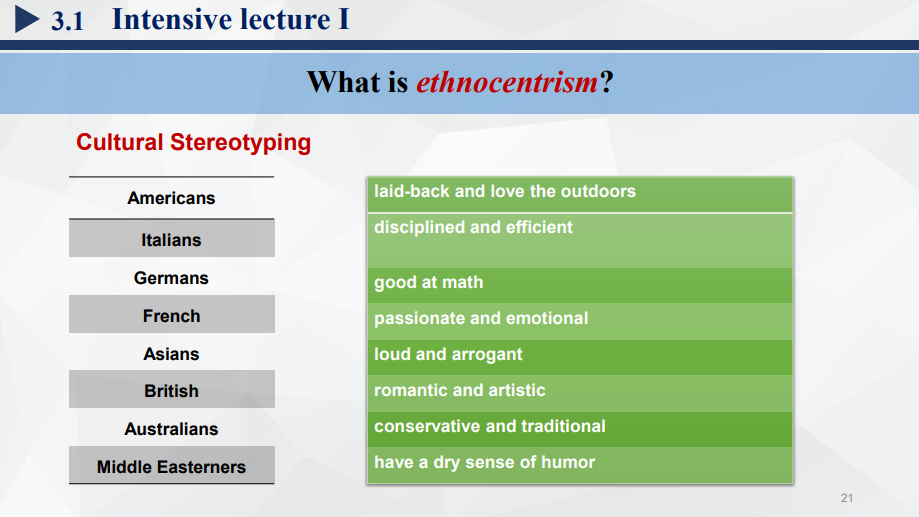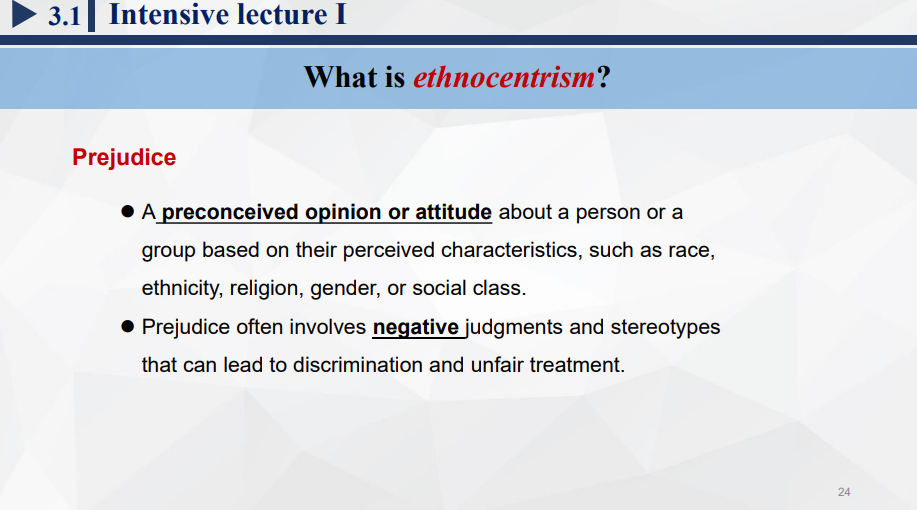 2. 概念探究:结合引入话题,通过教师讲授、小组讨论、快问快答等方式探究并同时巩固ethnocentrism、stereotype、prejudice、discrimination等概念的主要教学内容。