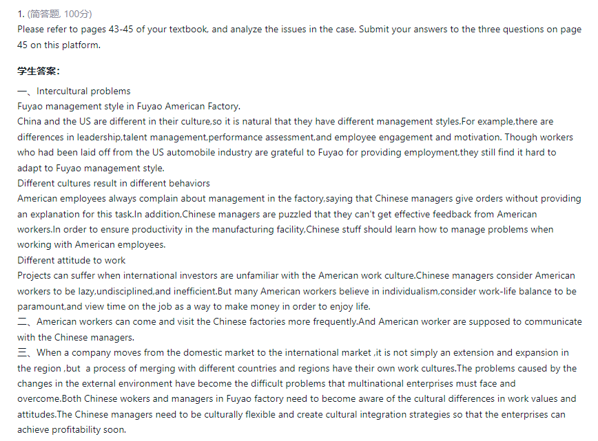 课后:教师在学习通平台布置课后作业,学生围绕真实跨文化交际案例,分析其中体现的跨文化冲突、找出原因,并提出解决方案,从而提升学生的跨文化交际意识和能力。