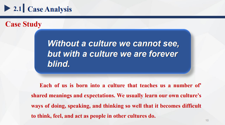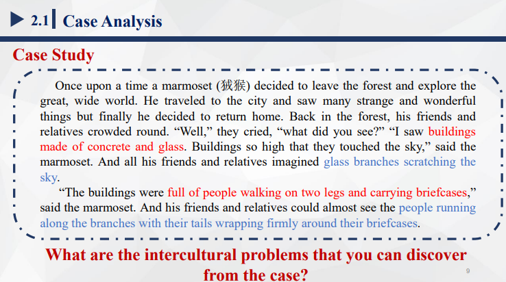 1.案例导入:分析一则跨文化交际寓言故事,引出跨文化交际中常见的交际障碍(片面的文化视角、民族中心主义)的存在;并通过对一则跨文化交际名言名句的解读,启发学生对于加强文化自信和避免狭隘民族主义的思考。