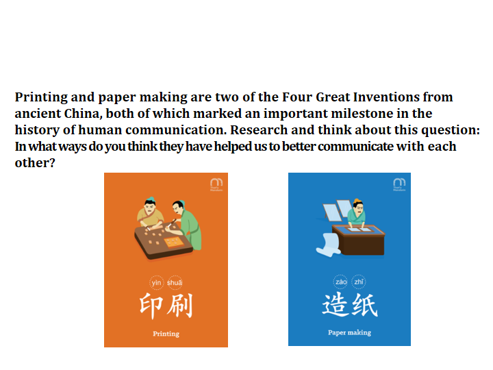 任务二:Printing and paper making are two of the Four Great Inventions from ancient China, both of which marked an important milestone in the history of human communication. Research and think about this question: In what ways do you think they have helped us to better communicate with each other?