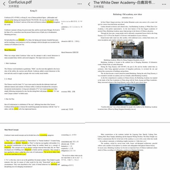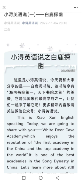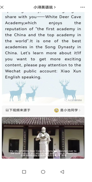 学生任务:复习课文、课外阅读任务。在学习通平台提供两篇阅读素材(孔子、白鹿洞书院),和观看授课教师的“小浔英语说”视频号或微信公众号中的“白鹿洞书院”短视频。