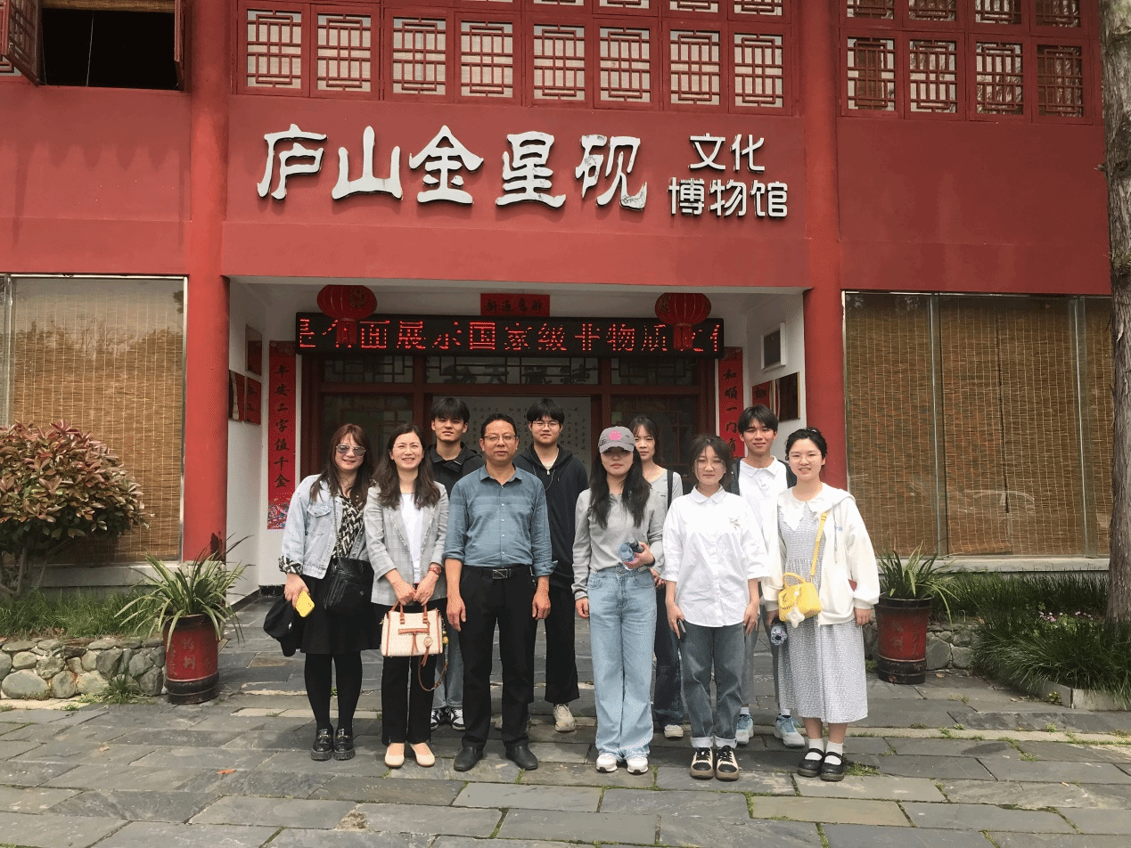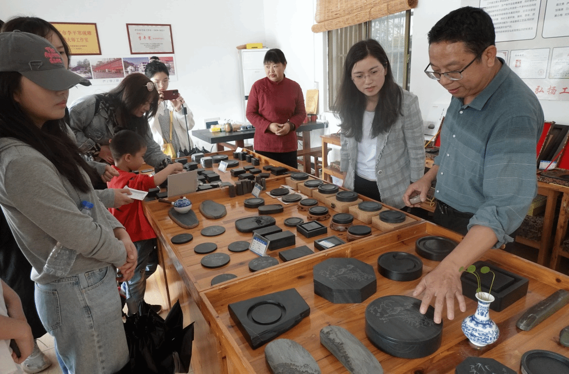 首先,师生团队前往庐山金星砚博物馆调研。为了给同学上好这堂实践教学课,博物馆馆长李平寒凭借30多年的非遗传承经历和丰富的专业知识,以饱满的热情生动地讲解了金星砚的石品、石质、历史、制作流程和技法等,带领着同学们深度探索国家非遗。在李馆长的带领下,师生们看到博物馆里的每一件展品都“活”了起来,了解到每件展品背后的历史故事及文化内涵。