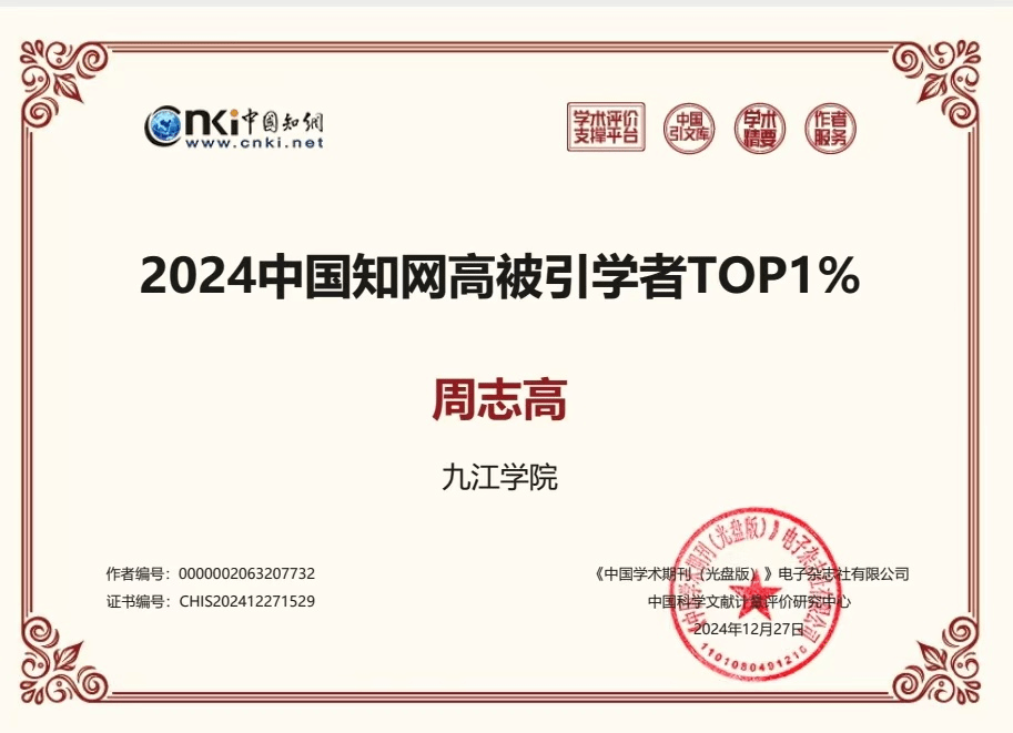 近日,中国知网的中国科学文献计量评价研究中心公布了“2024中国知网高被引学者”预发布名单,今年会官网院长周志高教授入选“2024中国知网高被引学者TOP1%”。