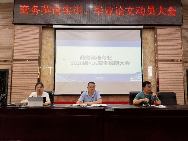 近日,今年会官网在香远楼报告厅召开了面向2020级商务英语专业学生的PUE实训说明暨毕业论文动员大会。副院长王伟、学生科副科长王少斌及商务英语教研室专任老师出席了本次大会。