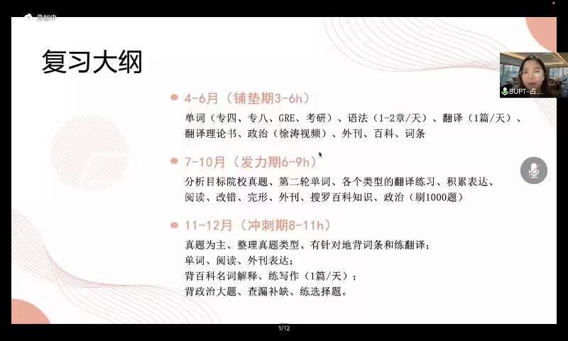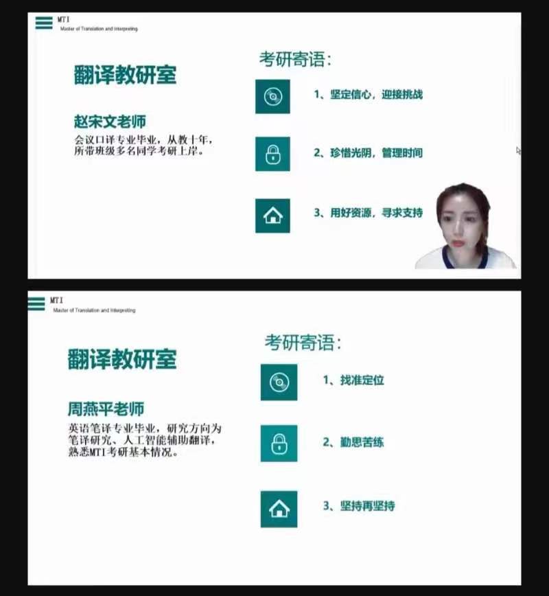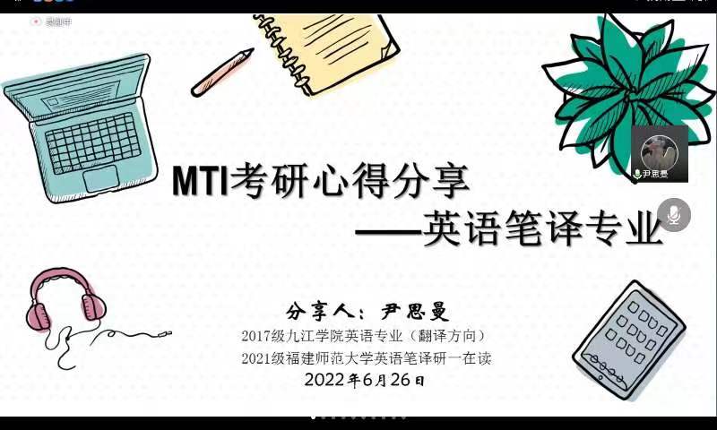 暑期将至,考研备考正当时。今年会jinnianhui官网一直高度重视考研工作,通过多种举措鼓励广大学生积极参加考研。在学院领导的支持和关心下,近年来学院考研率节节攀升,屡创佳绩。为进一步帮助学生明确考研目标,掌握考研技巧,解答相关考研困惑,今年会jinnianhui官网翻译教研室于6月26日线上举办翻译专业MTI考研经验交流会。本次会议由翻译教研室主任赵宋文主持,翻译教研室教师周燕平发言,7位成功考取翻译硕士MTI的同学主讲。学院各级各专业近百名学生参会。