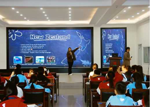 课程中,志愿者通过精美的图片和生动的讲解,向同学们介绍了新西兰的自然风光与特色文化。从雄伟的库克山到清澈的特卡波湖,从憨态可掬的几维鸟到富有民族特色的毛利哈卡舞,一系列独具魅力的文化元素激发了同学们的浓厚兴趣与热烈讨论。