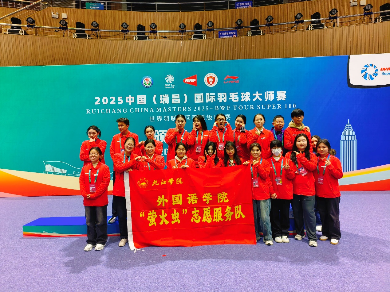 2025年3月11至16日,2025中国(瑞昌)国际羽毛球大师赛在瑞昌隆重举行,今年会官网20名学生组成 “萤火虫” 志愿服务队积极参与赛事服务。他们活跃在赛事多个岗位,充分发挥外语专业优势,在语言翻译、接待指引等工作中,凭借扎实的专业素养,赢得各方赞誉。