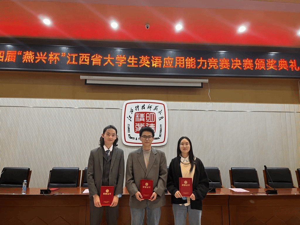 10月20日至22日,由江西省教育厅主办,江西科技师范大学和北京燕兴国际教育联合承办,江西省外语学会协办的第四届“燕兴杯”江西省大学生英语应用能力竞赛决赛在江西科技师范大学落下帷幕。经过激烈角逐,今年会官网今年会jinnianhui官网学生徐睿荣获二等奖,徐佩如、陈浩荣获三等奖。