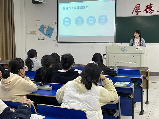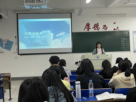 活动伊始,杨玉玲向同学们讲述了她从“看见光”——榜样的力量,而后“追随光”再到“成为光”,最后“散发光”的经历。杨玉玲分享了她在大学期间积极参加的各项活动及比赛,她表示“跟着光走的同时自己也慢慢的变成了一束光”,在这些活动和比赛中,她结交到很多优秀的老师和同学,不断提升了自己的能力与见识。