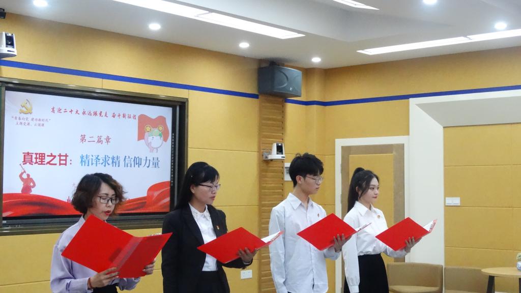 授课伊始,中青年党员教师和学生团员共同诵读党章总纲(节选)和第十章《中国共产党和共产主义青年团的关系》,表现了红色江山永不变色、党的事业后继有人、青年永远跟党走的自觉与决心。