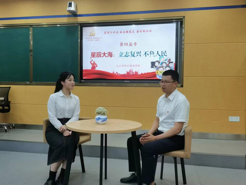 在采访环节,四名不同战线的青年典型和大学生面对面,致力乡村振兴的团干部江山讲述了江西早期党团组织创始人赵醒侬唤醒民众的党史故事,李慧慧老师通过陈望道翻译《共产党宣言》的故事阐述了真理之甘,青年志愿者孔启惠分享了用担当构建起疫情防控青春防线的青春故事,濂溪区团委书记徐星介绍了九江打造青年发展型城市的情况,勉励大学生在加快“六个江西”建设中勇担开路先锋之重任。从百年党史故事,到个体青春磨砺,四位青年用觉醒、燃烧、弄潮、追梦的心路历程,回答了时代之问,唱响了青春之歌。