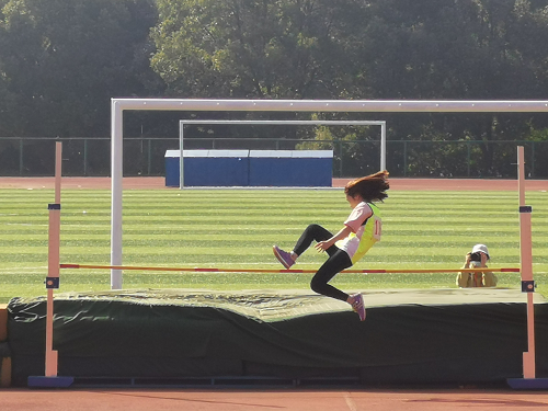 跳高场前,运动员们踢腿、甩臂、弯腰,做好一系列热身准备。双目注视跳高架上的横杆,待跑到踏跳线上,一脚猛蹬,奋起一跃,划出一道亮丽的圆弧。