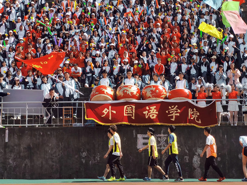 看台上,外院学子挥旗呐喊,打鼓助威,口号声震天动地。大家自发穿上红色衣服,在所处看台上摆出“GO”和“冲”的字样,格外引人注目,也为赛场上的运动员们鼓舞了士气。
