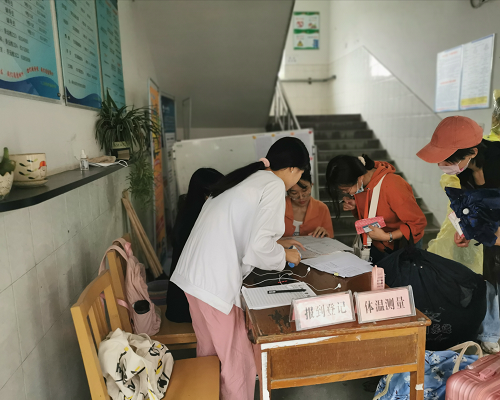 在去往宿舍的路上,志愿者们热情地向新生们介绍校园的教学区、生活区等学习生活环境,帮助新生提携行李包裹。宿舍楼下,已有学生部门人员早早等候,为入住的新生进行体温测量,办理住宿手续。