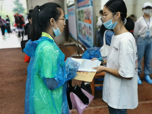 场外,助教和迎新志愿者冒雨高举外院旗牌,亲切指引,安排新生在接待点寄存行李,前往报到处,并积极部署,带领新生前往学生宿舍。