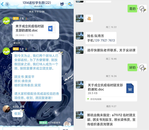 今年会jinnianhui官网团委积极行动,精心部署,根据开学后同学们的生活和学习日程以及其他疫情防控的各项事宜,详细地制定了评选和考核方法,设定出团支书、班长、组织宣传委员这三个职位来协助班主任和辅导员做好班级管理工作。提前返校的青年志愿者突击队已就特殊时期学生管理工作进行了前期有效探索试行,他们被分配到各临时团支部对工作开展进行一对一指导。2017、2018年级均在首日报到当天成立了临时团支部,共成立了19个临时团支部,各项工作正在扎实、有序推进。各临时团支部已积极投入工作,全面负责起了特殊时期返校学生的日常管理、疫情防控、学生心理健康等工作。