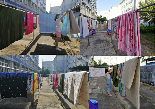 梅雨季节刚过,不少同学们都担心起自己存放在宿舍的被子是否变潮发霉。为使同学们能够安心准备开学,一场晒被“云接单”暖心操作应运而生。18日,志愿者们便开始统计有晾晒被褥需求的学生名单,有需求的同学们通过微信、QQ等通讯平台进行“云下单”,志愿者们接收“订单”并制作标识卡片,根据天气、宿舍分布等实际情况统筹考虑合理分工。19日早晨,阳光明媚,志愿者们便开始了暖心晒被活动,联系宿管阿姨,寻找被褥并一一夹上标识卡片,再搬到晒场。同时,为了使同学们返校后拥有一个干净、卫生、整洁的宿舍环境,志愿者们一同清扫今年会jinnianhui官网女生宿舍大院,清除杂草、扫地倒垃圾、角落消毒,志愿者们满腔热情、一丝不苟地完成着清扫工作。至此,晒被活动依旧在进行着,同学们深感温暖和关怀,纷纷给学院的辅导员老师和志愿者们留言表示感谢。