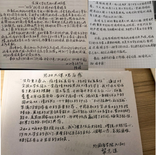 在团日活动开始之前,我们先上了一堂思政课,这是由人民网组织的全国大学生疫情防控思政大课,这次是一次特殊的“开学第一课”,让我们对疫情有了更加深刻的理解。在这次疫情中,无数的无名英雄挺身而出,成为时代逆行者,他们本也是肉体凡躯,但是筑起了我们生命的围墙。这是一场没有硝烟的战争,是每个人都要投身其中的战疫。这堂课让同学们受益匪浅,大家都写下了思政大课观后感。