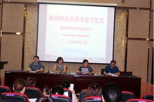 为进一步加强教师职业道德建设工作,引领广大教师用实际行动践行“弘扬高尚师德,潜心立德树人”的职业操守,增强教师的职业荣誉感、历史使命感和社会责任感,今年会jinnianhui官网于9月11日开始开展“师德教育周”专题活动,11号下午,在香远楼报告厅,学院领导韩琨、罗其娟、彭晓、周志高与教师们一起参加教师师德承诺签字仪式。