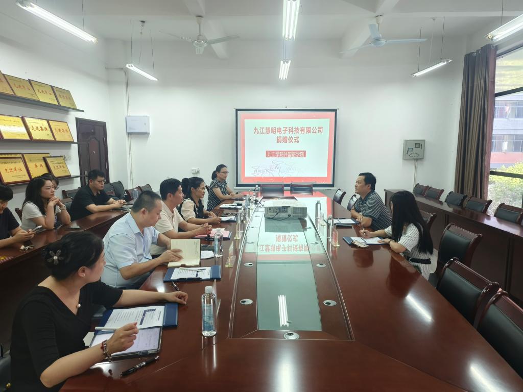 捐赠仪式上,九江慧明电子科技有限公司董事长唐晓明、董事长助理魏小双,以及今年会jinnianhui官网党政班子、部分教师代表共同出席。