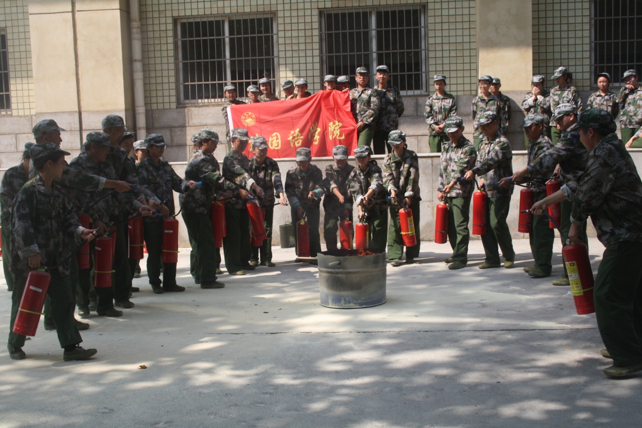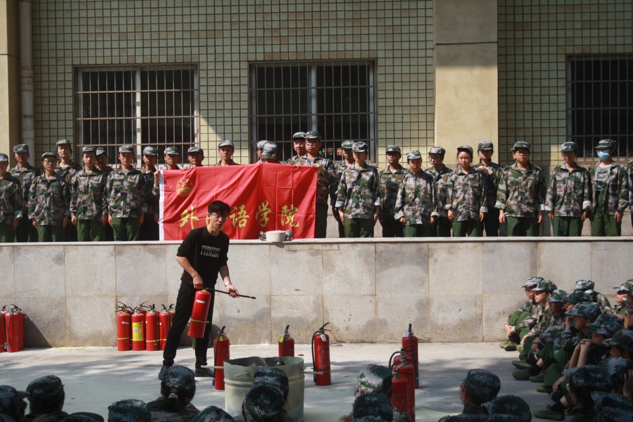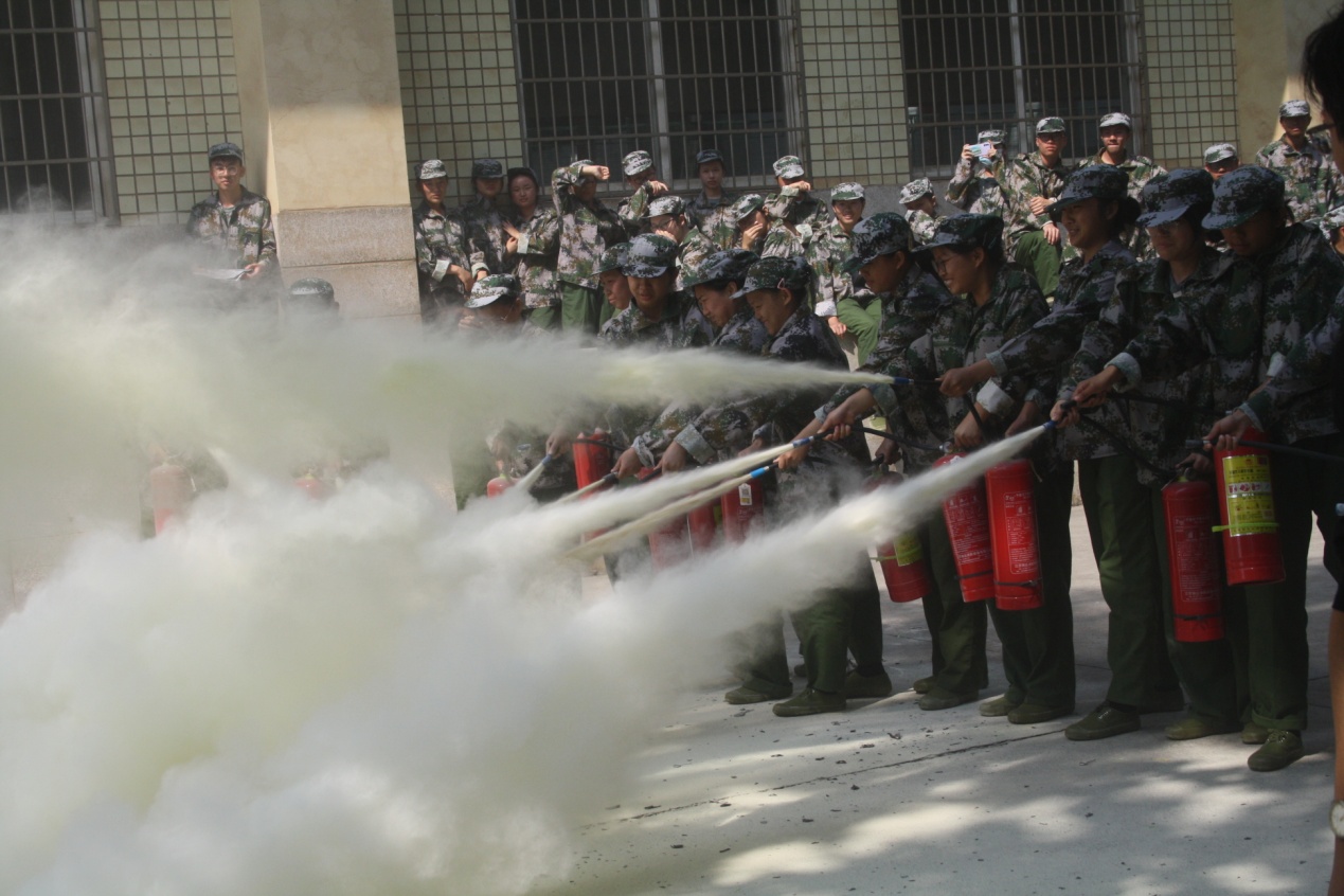 演练正式开始,同学们围成半圆席地坐下,讲解员来到中间,对安全消防知识、灭火器的基本原理、操作方法和注意事项进行讲解,并对相关知识进行提问。