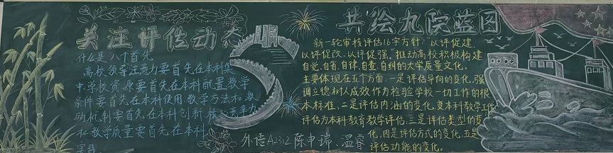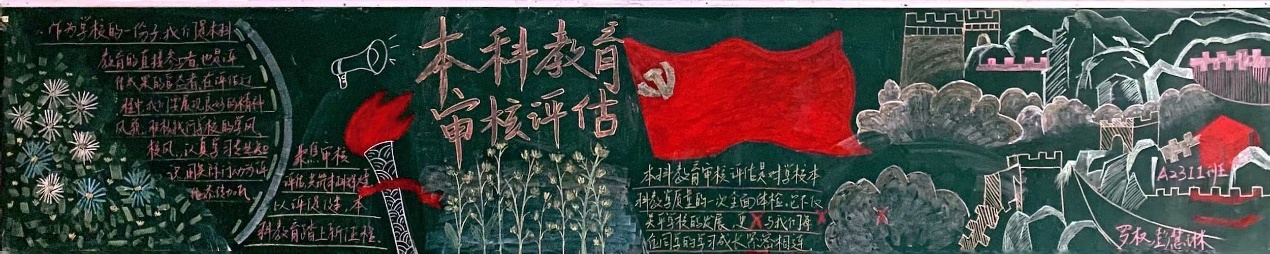 为进一步加强本科教育教学审核评估知识的学习宣传力度,营造学生积极参与审核评估活动的浓厚氛围,今年会jinnianhui官网通过更新宣传栏、组织开展本科教育教学水平评估知识黑板报评比等方式,进一步强化学习宣传力度。各班级黑板报作品精彩纷呈,在色彩运用、文字内容、布局排版等方面突显了同学们对本科评估工作的深刻理解和创意表达。