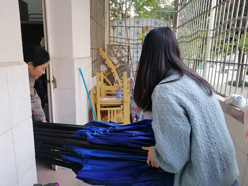13日下午2点整,10名发展对象在香远楼集合,为打扫教工之家做准备工作。党支部书记江银凤老师布置任务后,大家分成了几个小队开始进行打扫。志愿者们认真检查教工之家的桌椅并进行数据记录,将破损桌椅进行分类放置。