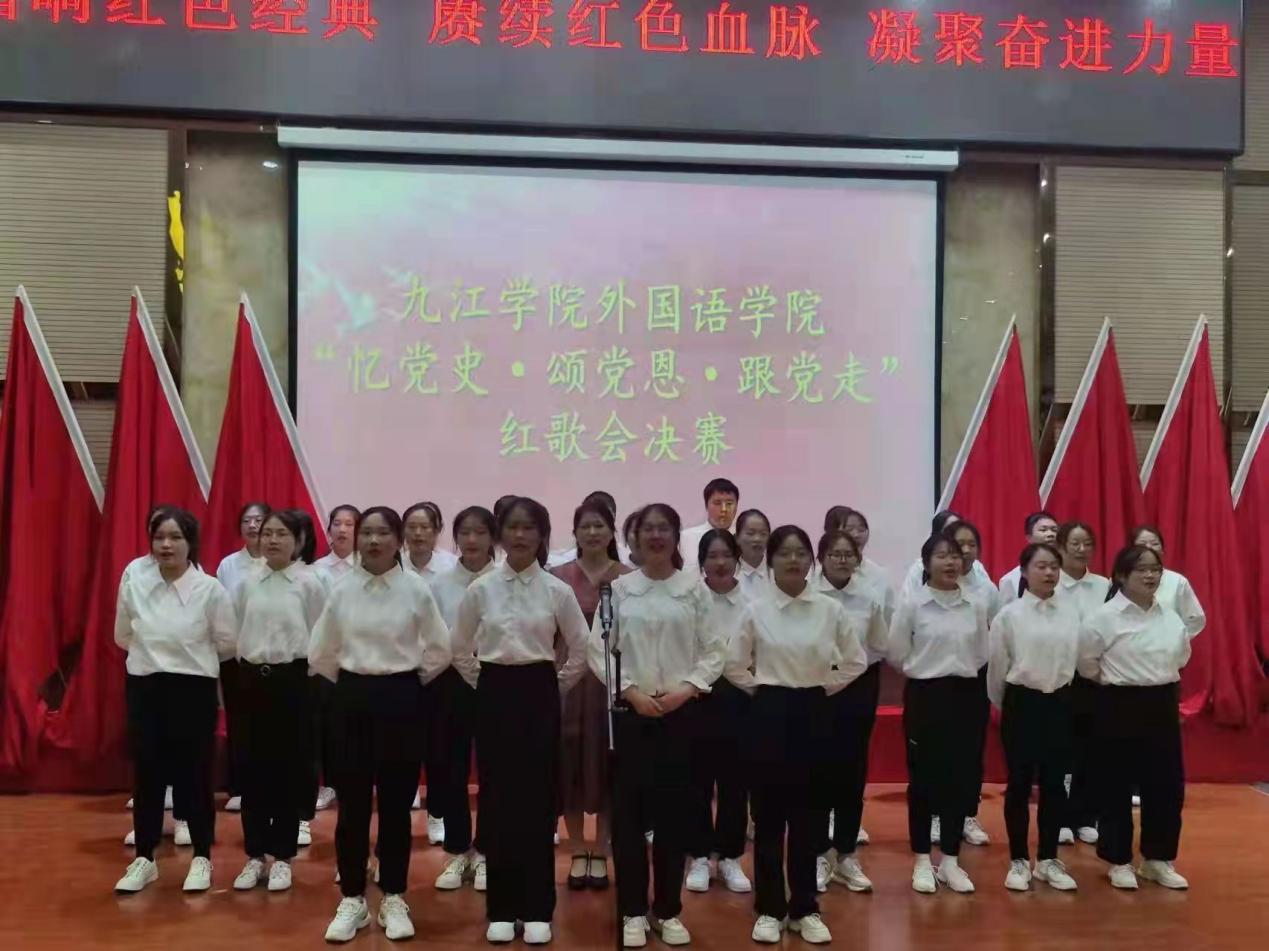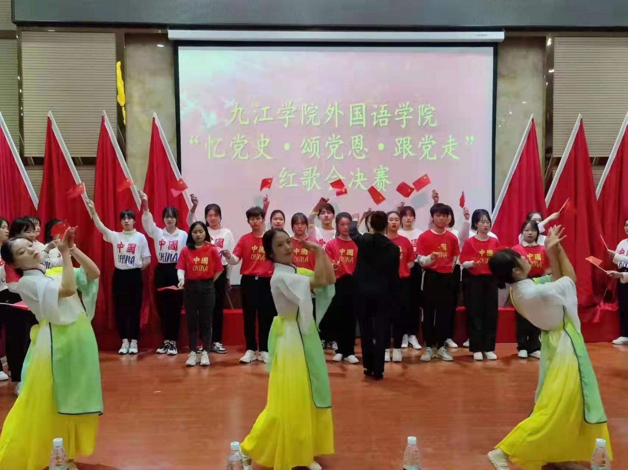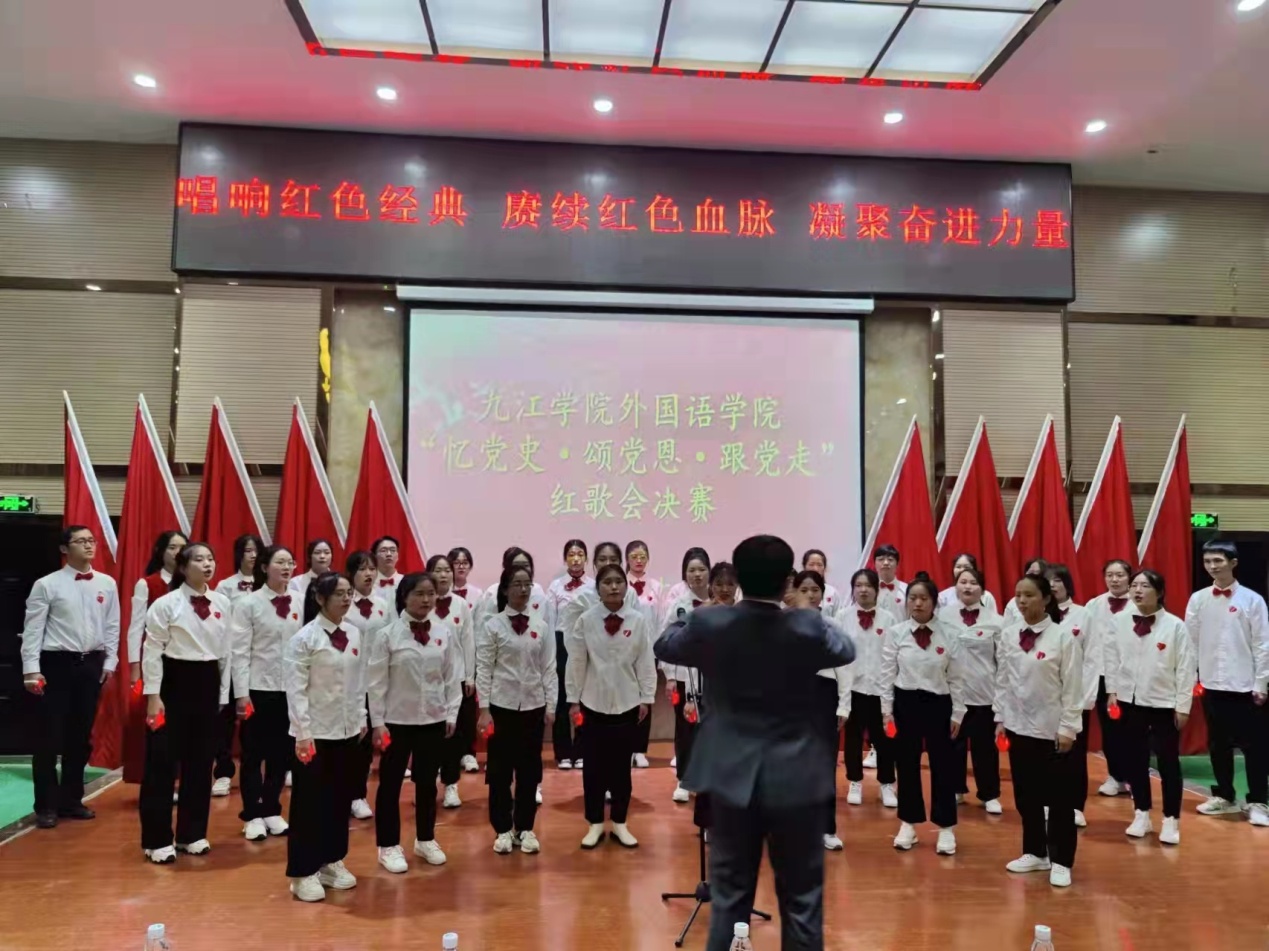 决赛阶段,班级按抽签顺序依次表演。参赛队员衣着统一,斗志昂扬,舞台环节丰富多样,有领唱、有歌伴舞、有歌伴朗诵等,通过各种形式展示着外院学子的爱国情怀和班级凝聚力。比赛中,各位班主任老师倾情助力班级的精彩表演。比赛中,项莉老师对外语A2031班同学的“少年灵魂三问”一次一次地鼓舞现场所有少年“担当责任于己身”,万敏、李超、李南云等老师在班级合唱队伍中倾力助演,外语A2033班章妍老师以舞抒情用舞蹈表达对党的热爱。台上师生以饱满的热情深情演绎了《没有共产党就没有新中国》《歌唱祖国》《红旗飘飘》等经典红歌,“少年志,则国志;少年富,则国富;少年强,则国强;少年独立,则国独立”声声赞歌,句句誓言,处处展现着外院师生“忆党史”初心不改,“颂党恩”百折不挠,“跟党走”坚定不移。比赛现场气氛热烈,高潮迭起,赢得了在场观众的热烈掌声和阵阵喝彩。比赛结束后,学生党员合唱团演唱了《我们走在大路上》。